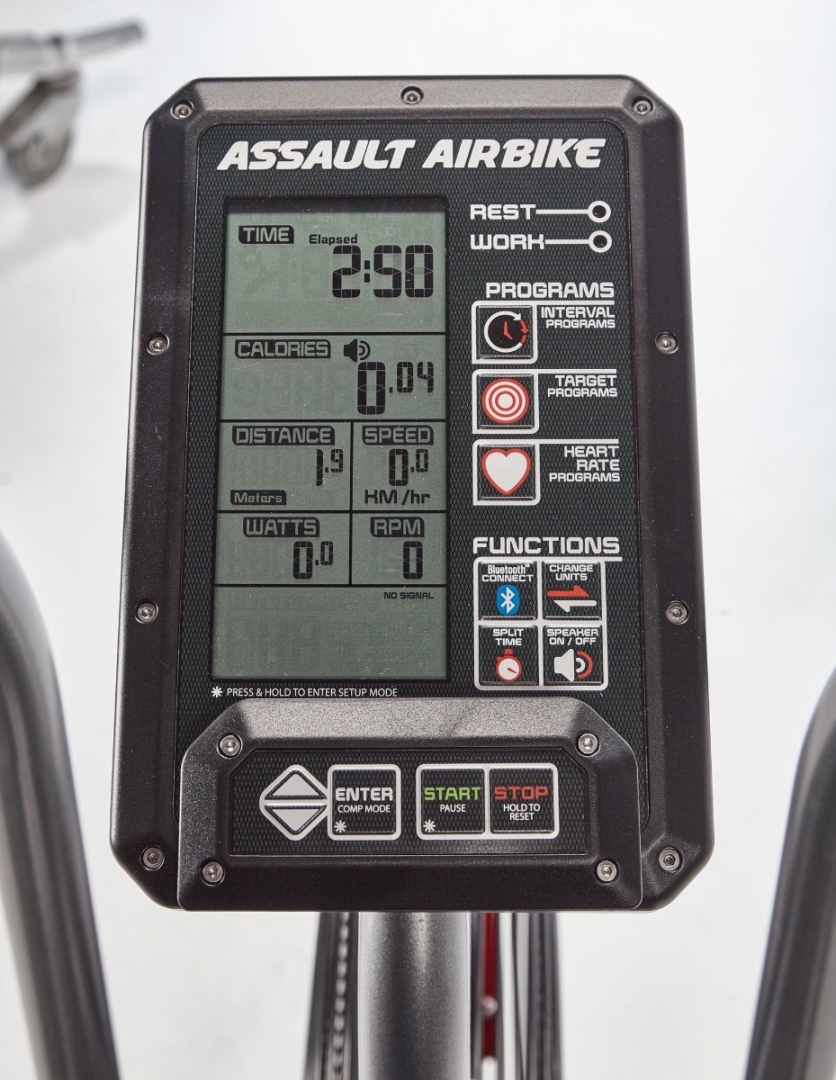 ASSAULT AirBike Elite yra hibridinis treniruoklis, jungiantis dviračio ir elipsinio treniruoklio funkcijas. Pedalų mynimas sudaro pusę darbo, o koordinuoti rankų ir kojų judesiai su ventiliatoriaus pasipriešinimu suteikia visapusišką kūno apkrovą, treniruojant tiek apatinę, tiek viršutinę kūno dalį. Tai fiziologiškai intensyvus treniruoklis, ypač kai naudojate jėgą maksimaliam tempui.