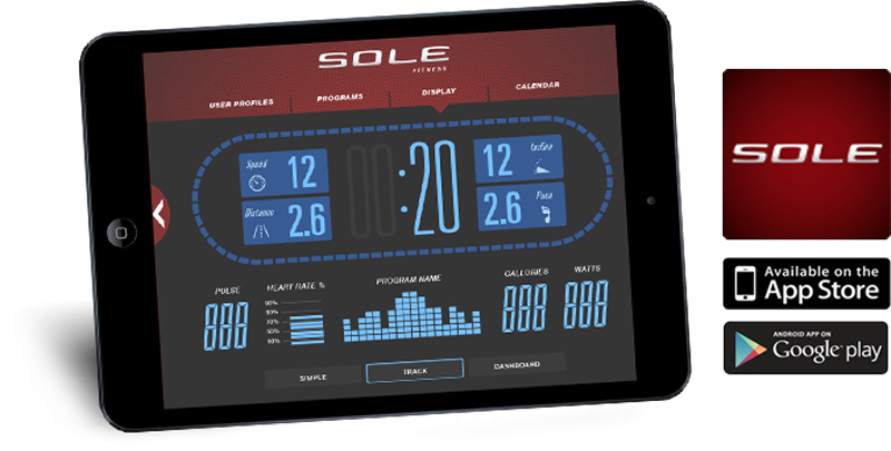 garso sistema: garsiakalbiai ir audio jungtis, "bluetooth" ("Sole fitness App");