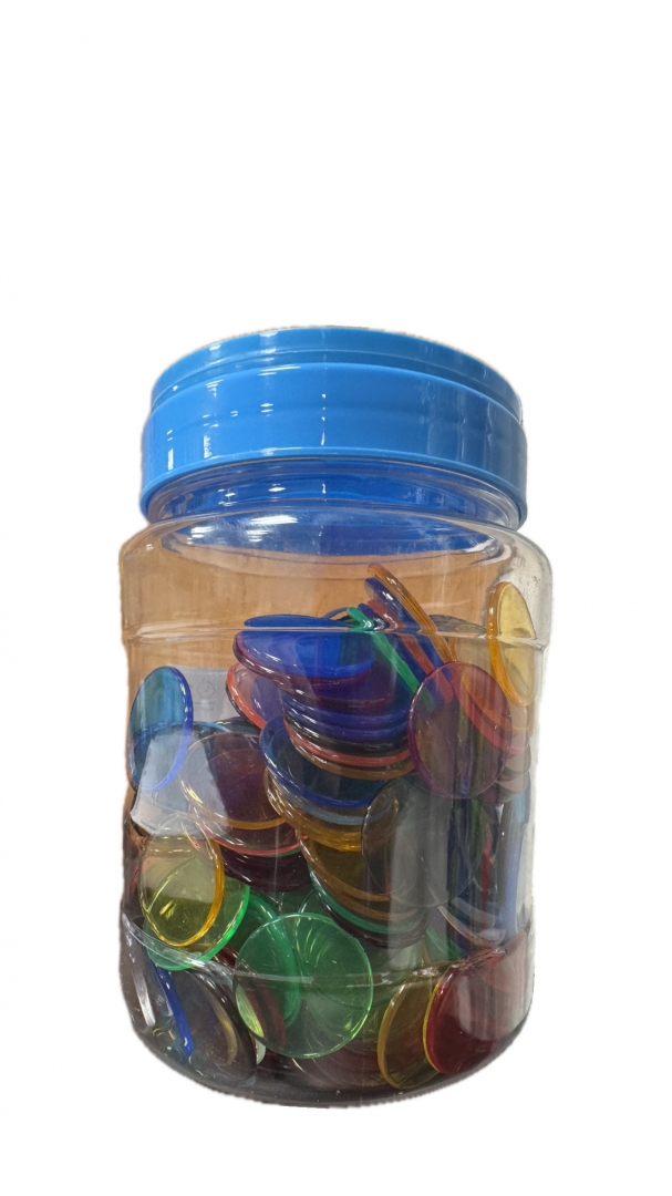 Dėžutė su 300 spalvotų diskelių. Esminis įrankis praturtinti mokymąsi edukacinėje aplinkoje.