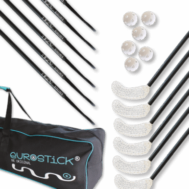 12 grindų riedulio lazdų ir 6 kamuolių rinkinys kartu su praktiška kuprine.