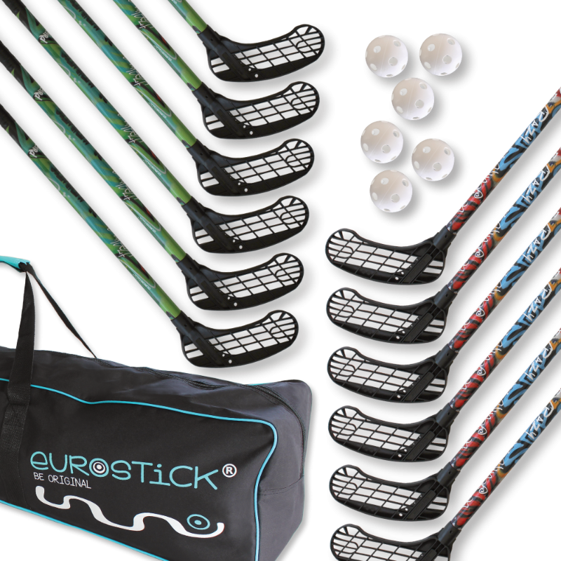 12 grindų riedulio lazdų ir 6 kamuolių rinkinys kartu su praktiška kuprine.