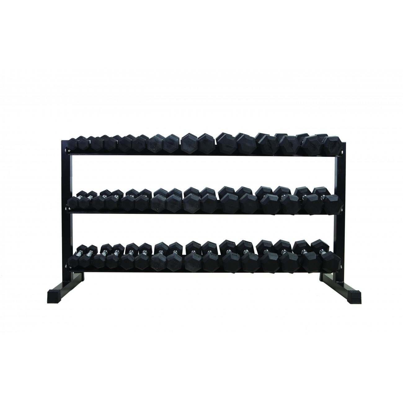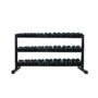 Trijų pakopų šešiakampių hantelių stovas yra tvirtas ir praktiškas sprendimas saugiam ir tvarkingam šešiakampių hantelių laikymui sporto salėse, sporto centruose ir profesionalių treniruočių erdvėse.