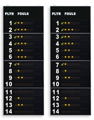 Favero FS-414A šoninės statistikos švieslentės rodo žaidėjų numerius ir pražangas (po 14 žaidėjų kiekvienai komandai). Puikiai tinka krepšiniui, tinkliniui, salės futbolui, rankiniui ir panašiai.