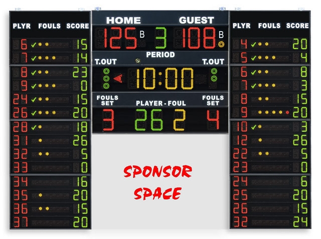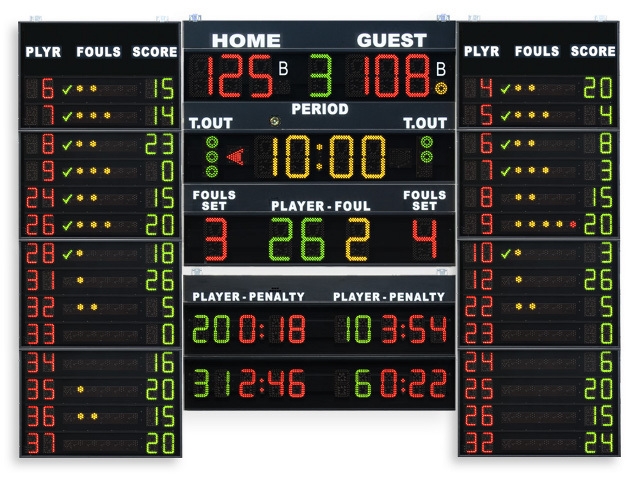 Favero FS-414C šoninės statistikos švieslentės rodo žaidėjų numerius, pražangas ir taškus (po 14 žaidėjų kiekvienai komandai). Puikiai tinka krepšiniui, tinkliniui, salės futbolui, rankiniui, vandensvydžiui ir panašiai.