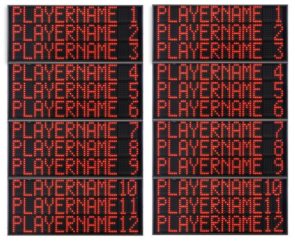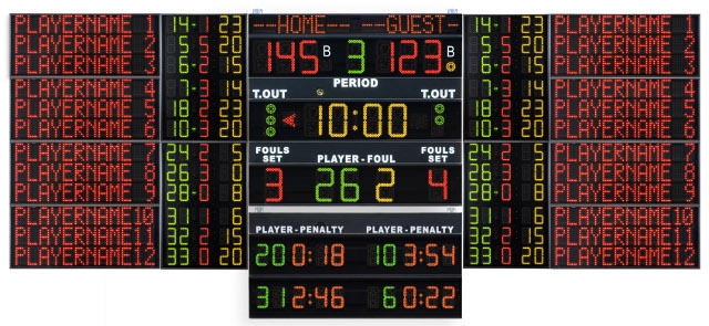 Favero FS-412F šoninės statistikos švieslentės rodo žaidėjų vardus (po 12 žaidėjų kiekvienai komandai). Puikiai tinka krepšiniui, tinkliniui, salės futbolui ir panašiai.