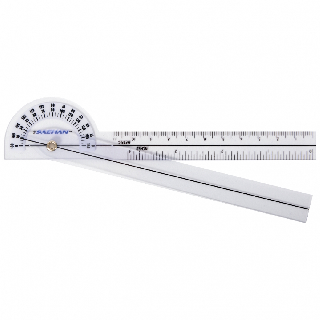 Nedidelis, patogus nešiotis goniometras, pagamintas iš plastiko. Ilgis 15 cm. Skalė nuo 0º iki 180º.