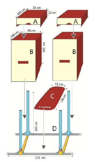 – 2 viršutiniai moduliai (A): matmenys = 160 x 58 x 12 cm (IxPxA)