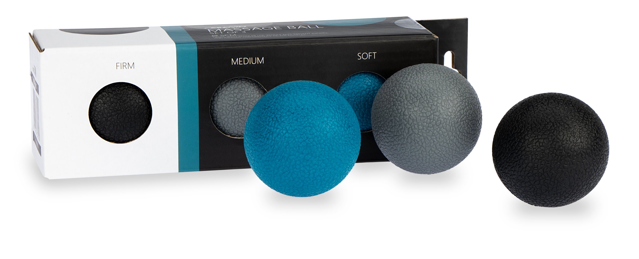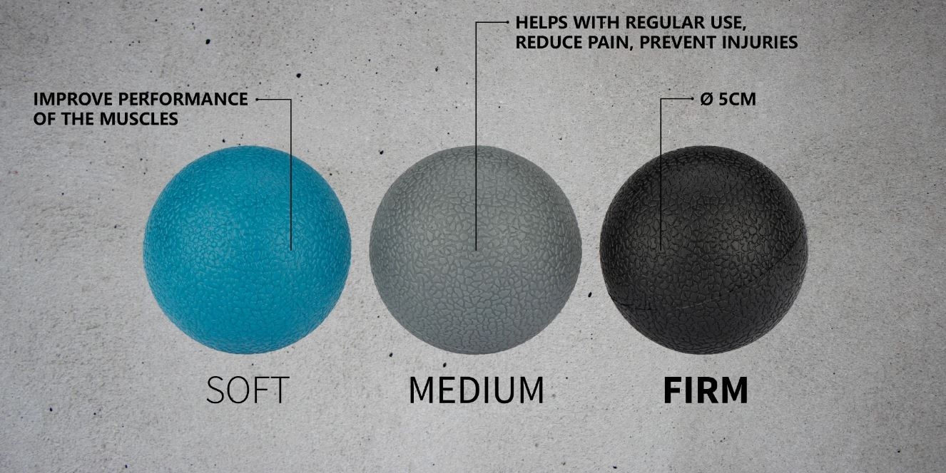 3 masažiniai kamuoliukai: 1x minkštas, 1x vidutinio kietumo, 1x kietas