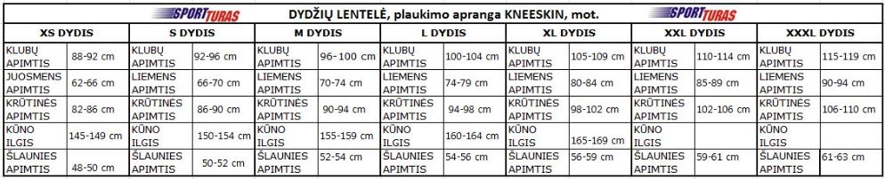 REKOMENDUOJAME RINKTIS PLAUKIMO APRANGĄ VIENU DYDŽIU DIDESNĘ NEI NURODYTA DYDŽIŲ LENTELĖJE!