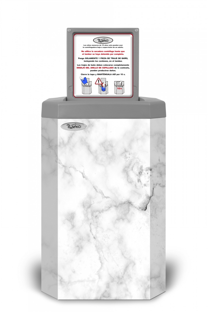 • vidinis džiovinimo būgnas į kuri dedasi maudymosi kostiumėliai, glaudės pagaminats iš nerūdijančio pasyvuoto plieno AISI 316 Ti, išorinis iš ilgaamžio plastiko PE;