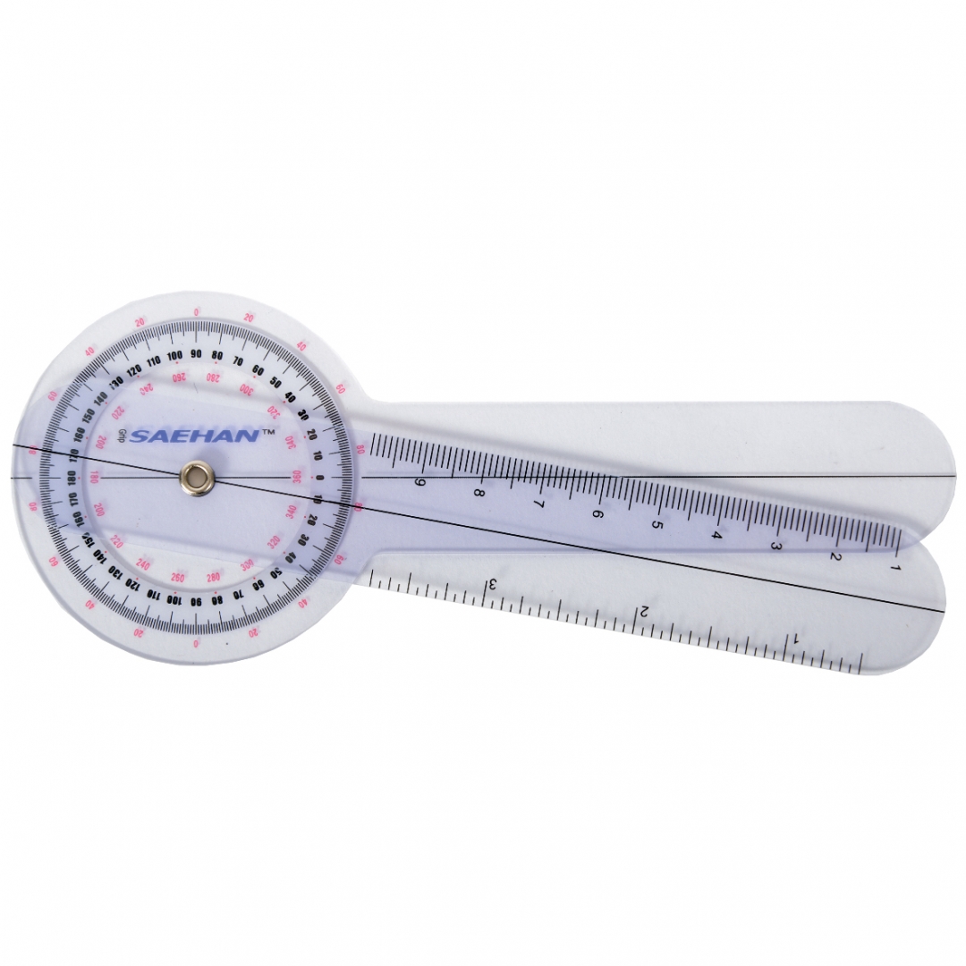 Goniometras, skirtas sąnarių sulenkimo kampams matuoti. Pagamintas iš skaidraus plastiko. Trys skirtingos skalės. Matavimo intervalas – 1°, matavimo skalė: 0 – 360°. 15 cm.