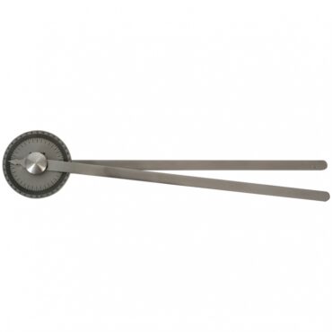 Goniometras, skirtas sąnarių sulenkimo kampams matuoti. Pagamintas iš skaidraus plastiko. Trys skirtingos skalės. Matavimo intervalas – 1°, matavimo skalė: 0 – 360°.