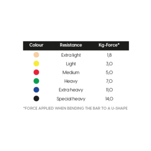 | Pasipriešinimo lygis | Geltona (lengvas), Juoda (labai didelis), Mėlyna (didelis), Raudona (vid. silpnumo), Smėlio (labai lengvas), Žalia (stiprus) |