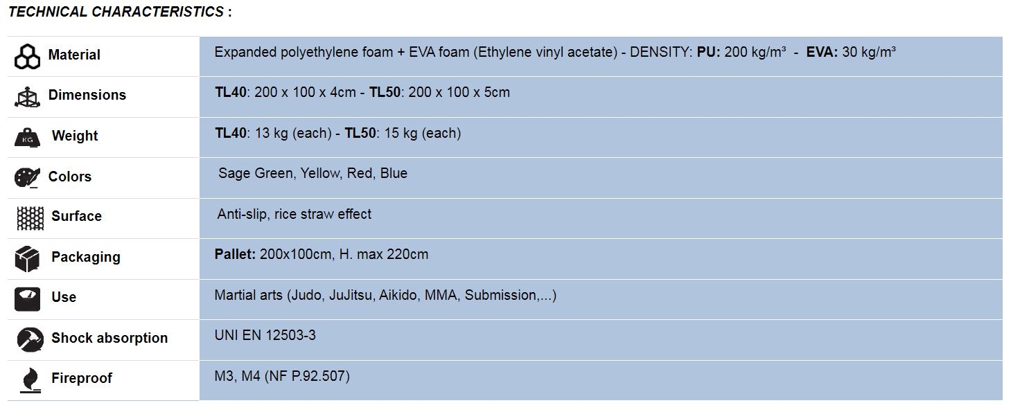 APRAŠYMAS: Šis tradicinis dziudo tatamis yra technologijų evoliucijos simbolis. Vidus yra hibridinis: pagamintas iš putų poliuretano + putplasčio EVA, padengtas iš viršaus ir iš šono vinilo paviršiais. Jis yra labai patvarus ir plaunamas. ,,Ryžių šiaudų,, efektas užtikrina stabilią padėtį, nes dugnas yra padengtas neslystančia guma.
