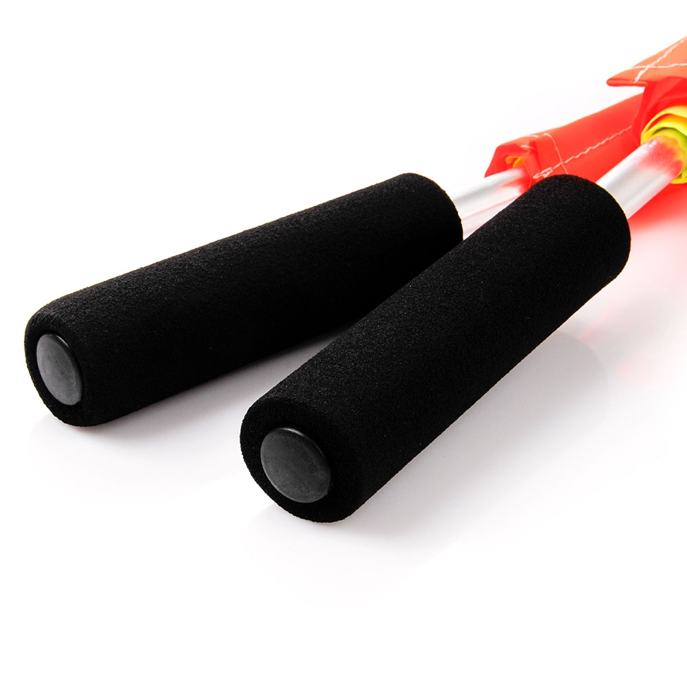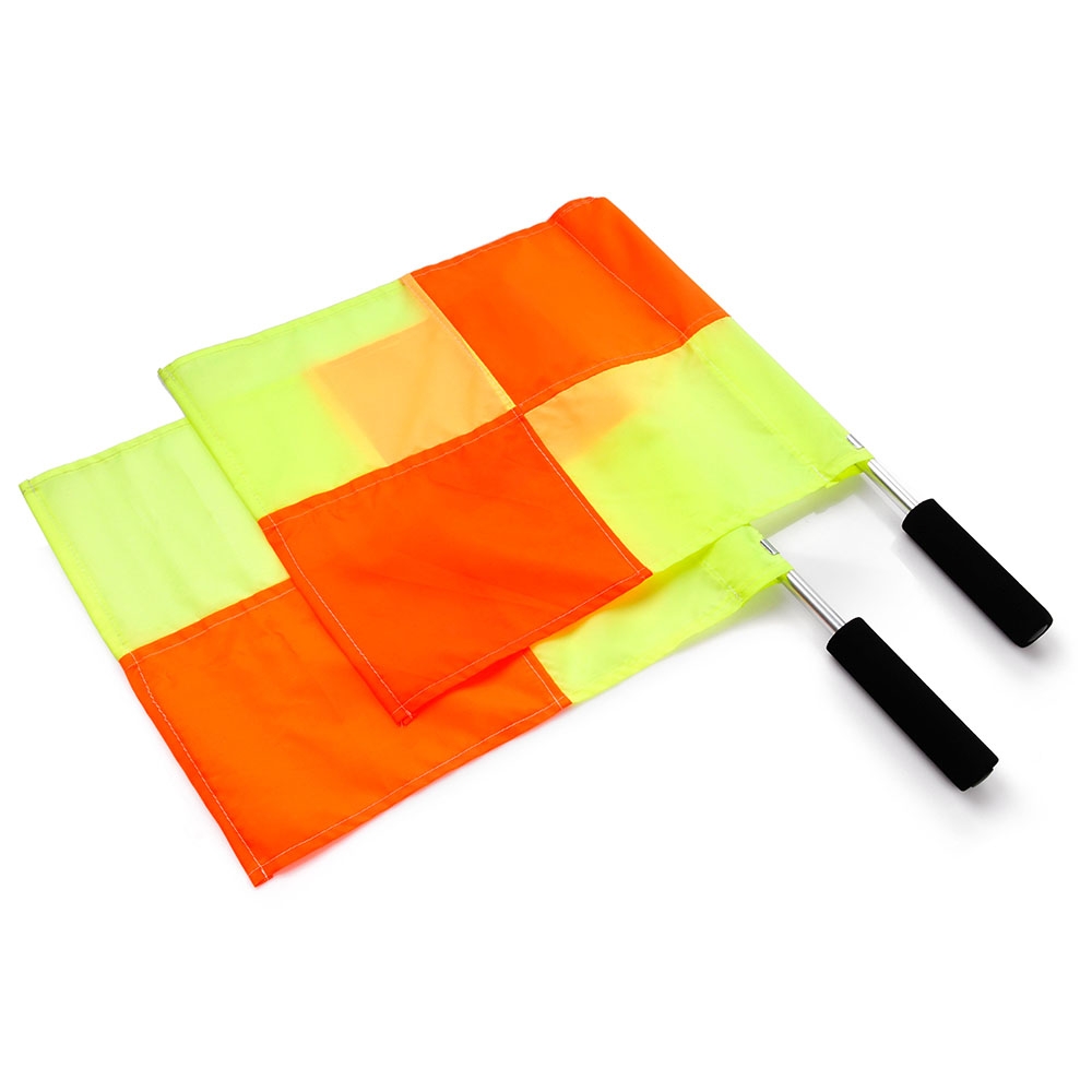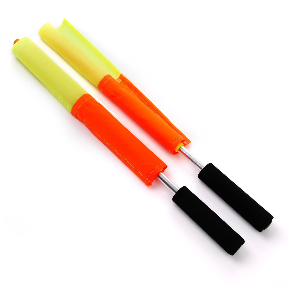 Ryškių spalvų vėliavos pagerina matomumą net esant nepalankioms oro sąlygoms. Matmenys: 50 x 50 cm Medžiaga: poliesteris Rankenėlės: aliuminio rankena su paralonu Spalva: oranžinė - geltona Kiekis pakuotėje: 2 vienetai