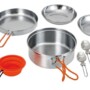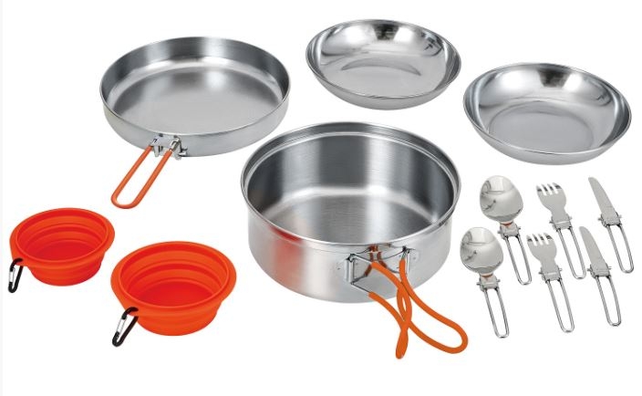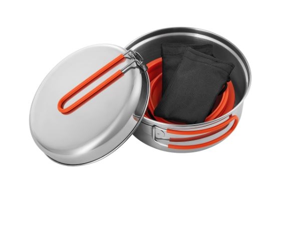 Pagrindinis rinkinys gaminimui lauke. KING CAMP Adventurer I pro apima 1,5 litro puodą ir 0,5 litro keptuvę bei daug kitos praktiškos įrangos, skirtos valgyti lauke. Praktiškas nerūdijančio plieno indų rinkinys idealiai tinka dviems žmonėms.