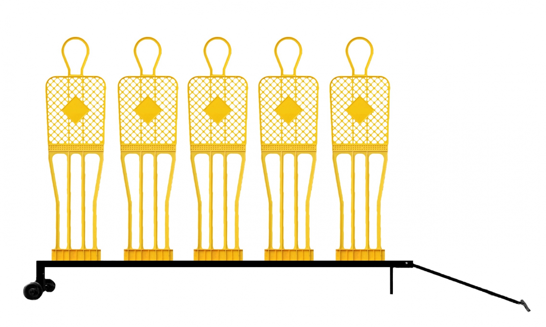 Paruoštas pastatyti 5 laisviems manekenams. Lengvai keičia poziciją, yra ratukai ir patogi rankena traukimui.